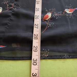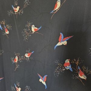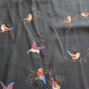 The main feature is the vibrant bird print. The print consists of small, colorful birds in shades of red, white, and blue, some perched on delicate wintery, blossoming branches with tiny white, gold, and red accents. The print gives it a whimsical and slightly vintage or romantic feel.
