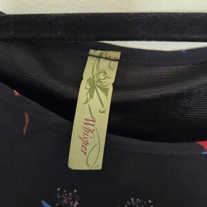 Tunic style top with a dark navy overlay fabric and a scoop neckline. there is no size tag please see measurements. there is no stretch to this shirt and it has one slight pull that you can see pictured.