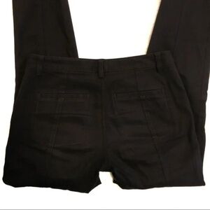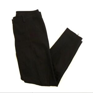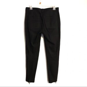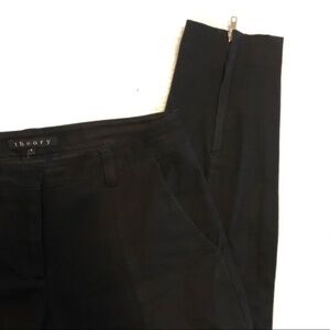 Theory black ankle zip skinny cropped pant. Pockets on front and back. Zippers with silver hardware on each calf. Seam down each side of the legs, as well as front.