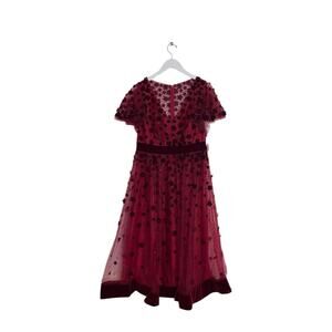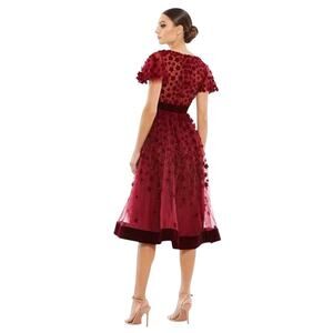 Mac Duggal size 10 elegant fit and flare midi dress in a rich burgundy tone. Features 3D floral appliqué detailing, delicate beaded accents, and a flattering velvet waistband that defines the silhouette. The sheer overlay adds texture and movement, while the velvet trim at the hemline completes the look with timeless sophistication. Perfect for weddings, holiday parties, or formal events.