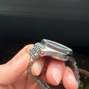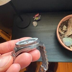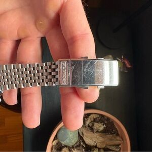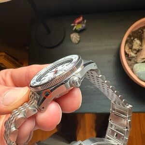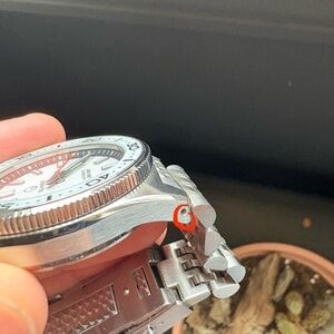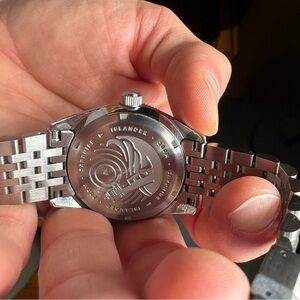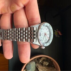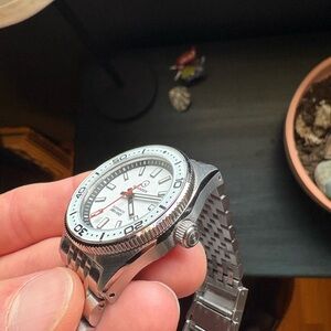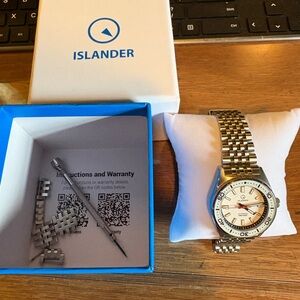Islander Northport 37mm watch in white. Crystal and bezel are in great shape. Very minor scratches on the case. Some scratching on the bracelet as expected. Still keeps great time. Original box and links included!
