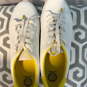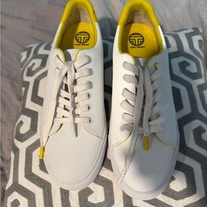 Chic Tory Sport sneakers in white with vibrant yellow details. Ideal for everyday style.
