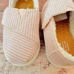 Cozy slip-on slippers by TOMS. Soft pink with a plush interior. Easy to wear and stylish.