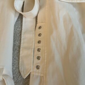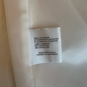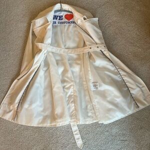 Stylish white trench coat with a sleek belt. Features a classic design and elegant details. Zipper closure with belt. Lined. Pleats on the back. Adjustable belt. Like new condition!