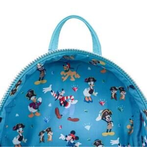 Argh Matey! This Exclusive Pirate Mickey mini backpack features all your favorite Disney Characters scouring the oceans for buried treasure. This Loungefly mini backpack features a stylish exterior with stitching accents and a zip closure. Top handle is perfect for carrying and the adjustable back straps add versatility. An enamel zipper charm of skull and crossbones lends the perfect finishing touch.