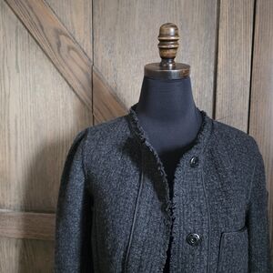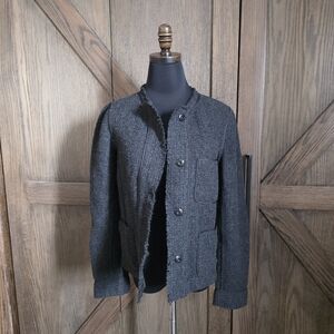 Stylish wool charcoal blazer jacket with snap button-up front. Features a textured finish and front pockets. Ideal for layering. size 8. excellent condition.