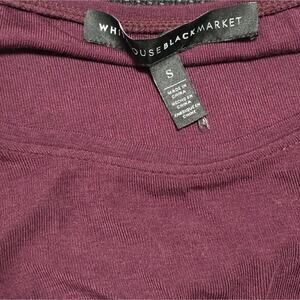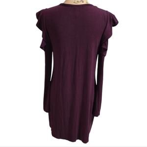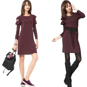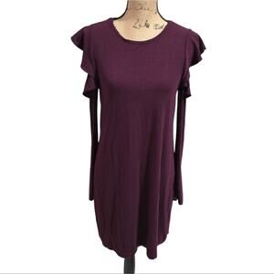 WHBM Chic Burgundy Ruffle Sleeve Stretch Comfy Dress Size Small Stylish Purple burgundy dress with ruffle sleeves. Perfect for casual outings or a night out. Pair with sneakers or boots for a versatile look.