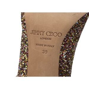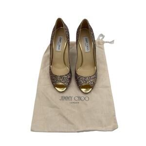 JIMMY CHOO Evelyn Multicolor Glitter Peep Toe Gold Heels Shoes Size 39 US 9