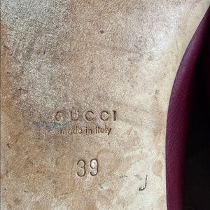 Luxurious Gucci flats in deep Burgundy leather. Features signature gold logo detail. Perfect for elegant outings or casual wear. Made in Italy.