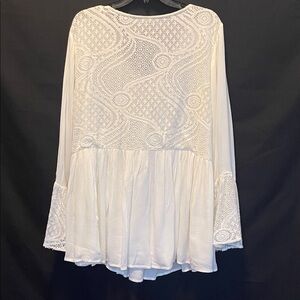 This elegant cream lace top is perfect for any occasion. Its intricate design adds a touch of sophistication to your wardrobe. A very bohemian look. Gently worn in great condition.