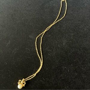 Bow- Pearl- Rhinestone Pendant Gold Tone 18” Chain