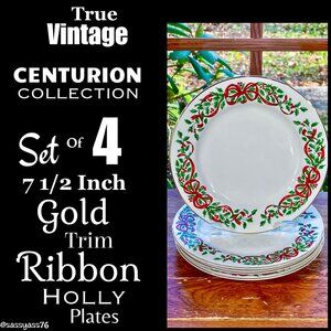 🆕VTG▪️CENTURION COLLECTION▪️Set of 4 Gold Trim 7.5" White Ribbon Holly Plates