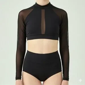 Stylish black two-piece dancewear set. Includes a long-sleeve crop top and high-waisted bottoms. Perfect for dance or fitness. This is a brand new with tags (NWT) two-piece activewear set, potentially for dance, gymnastics, or swimwear, by the brand balTogs. The set features a trendy high-neck crop top with long, sheer mesh sleeves and an opaque mesh panel down the center front. The matching bottoms are high-waisted briefs with full coverage and a built-in, flattering, thick waistband for support. The color is a vibrant, eye-catching coral pink or hot pink. The material appears to be a stretchy, athletic fabric ideal for performance.