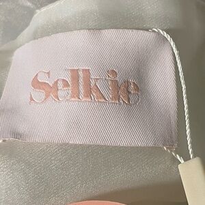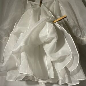 Elegant mini dress by Selkie. Features sheer puff sleeves. Perfect for special occasion.