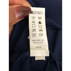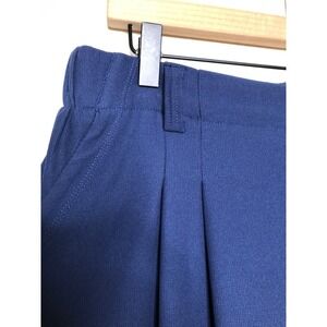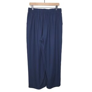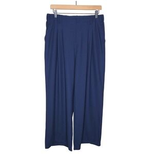 Navy blue wide leg palazzo pants by Halara. Elastic waistband with a flat front and belt loops. Features front pleats and convenient side pockets. Versatile for casual outings or a relaxed office look.