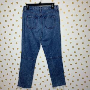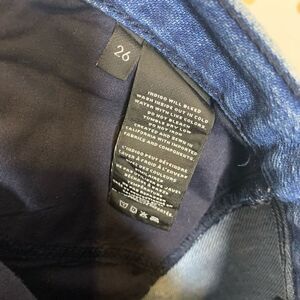 •Features: Light acid wash with frayed detail at the knees and raw hem. Cropped just above the ankle. Fabric does not have any stretch. Circular patches have been applied on the inside pockets to reinforce the pockets ends (shown in last photo)