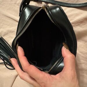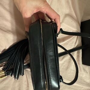 Chic black crossbody with chevron pattern. Features iconic YSL logo in gold. Stylish and versatile.
