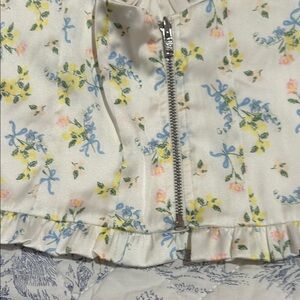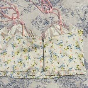 Charming floral bralette with lace details. Features delicate pink ribbons and blue bow accents. Perfect for a feminine touch. Worn just to try on. No tags