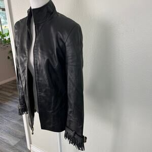 St. John Sport By Marie Gray SZ 6 Black Leather Jacket Removable Fringe Collar
