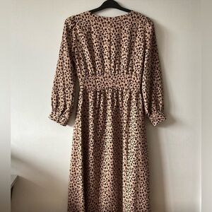 Stylish midi dress with a leopard print. V-neckline with defined waist, quality sewn buttons and closures, 3/4 length sleeves. Perfect and beautifully made.