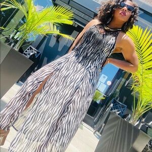 Black and white will forever be a staple in the fashion industry! The versatility of it appeals to all aesthetics. Our zebra print “Eve” dress captures that concept while adding that resort vibe most are seeking for this summer! Made from a sheer polyester chiffon with built in lining and bra cups this dress glides over your curves with just the right amount of movement! The bodice has flattering lace fringe applique detail for that bohemian vibe. Center back zipper along with securing hook and eye closure.