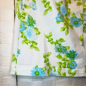 This classic piece features a vibrant all-over print of blue and light green roses and foliage on a crisp white background. It has a tailored, A-line silhouette with two front pockets and a zip-fly closure. Perfect for a preppy, resort, or casual chic look.