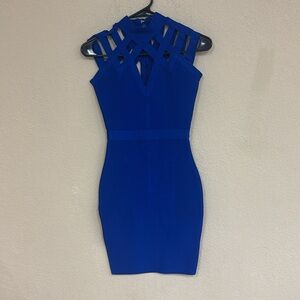 Stunning blue mini dress. Features a unique crisscross neckline. Perfect for a night out.