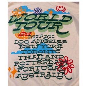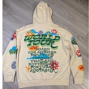 Keywords: music festival, streetwear, graphic hoodie, world tour, concert apparel, casual wear, oversized fit, smiley face, floral print, summer festival, urban fashion, collectible