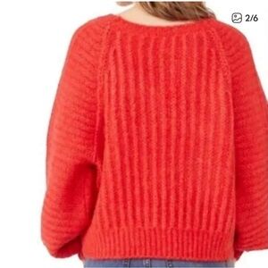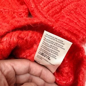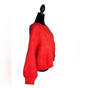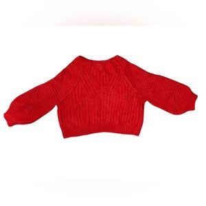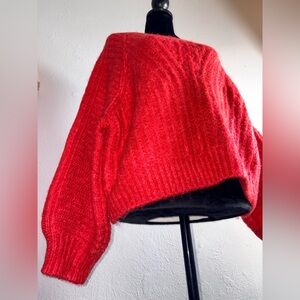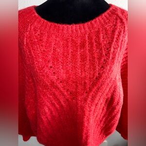 Cozy red sweater with a crew neck. Features ribbed texture. Perfect for casual wear.