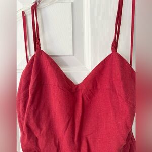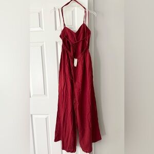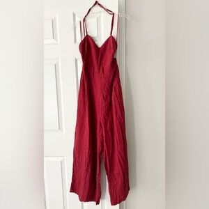 In beautiful dark red color this adorable jumpsuit offers wide-leg construction, side slant pockets and adjustable tie back closure!