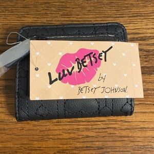 The Betsey Johnson Luv Betsey bi-fold wallet features a charming heart print, providing both style and functionality. Ideal for organizing your essentials with ample card slots and a rear zipper for coins.