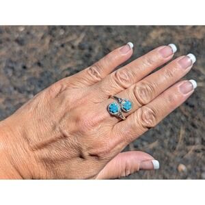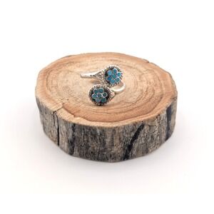 Discover the Timeless Elegance of our Zuni Native American Sterling Silver Turquoise Flower Inlay semi adjustable bypass ring.
