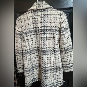Stylish plaid coat. Features button closure. Perfect for layering.