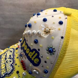Show your Sorority Hat. Featuring a vibrant yellow, blue and white design, this hat is adorned with colorful embellishments for any college/ SOROR event.