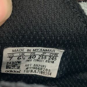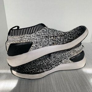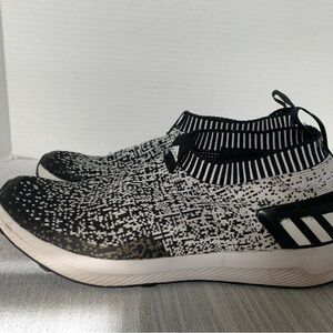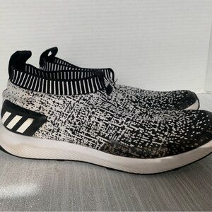 Adidas Rapida Run Black/White Laceless Knit Athletic Sneakers Size 7 Stylish black and white slip-on sneakers with a unique pattern. Comfortable and easy to wear. Has a Pringle Stan on the inside side I have not cleaned them up but they will with some OxiClean I only worn this like 5 times so there good used condition!
