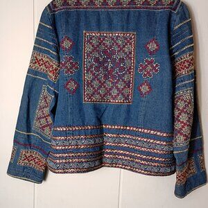 Beautiful denim blazer jacket. Embroidered with red and gold threads. Floral and quilted pattern. Hidden snap closure.