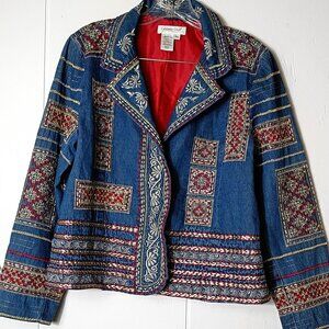 Coldwater Creek Denium Jacket Tapestry Blazer Embroidered Gold Red Womens PM