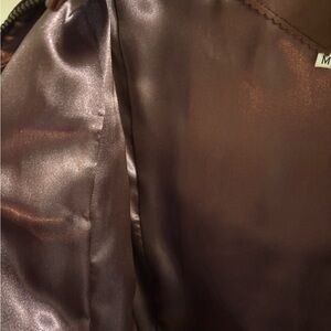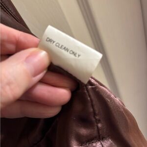 Sleek 100% leather vest with zip front, polyester lining. Adds a refined touch. This is a stylish brown leather vest from CAbi, featuring a sleek design with a front zipper closure. Perfect for layering in cooler weather.