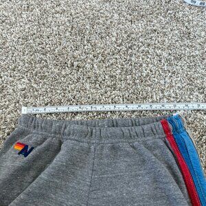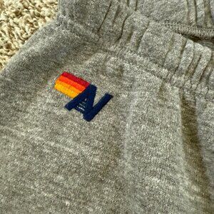 Aviator Nation 5-Stripe Sweatpants - Heather Gray - M Super soft, vintage-style Aviator Nation joggers with signature colorful stripes (5 on one leg, 2 on the other) and embroidered rainbow "AN" logo. Made in California, USA. Details: Brand: Aviator Nation Color: Heather Gray Material: Soft fleece Waistband & ankle cuffs: Elastic with drawstring Condition: Excellent pre-owned Measurements (Flat Lay): Waist (unstretched): ~14" Inseam: ~28" Authentic and comfy—perfect for lounging or everyday wear!