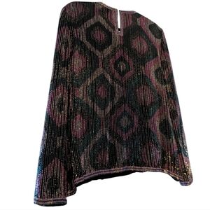 100% silk shell with hand beaded symmetrical design pattern using iridescent beads in pinks, blues, purples, that catch the light beautifully