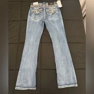 Mid-rise, medium-wash bootcut jeans- Floral geometric design on back yoke with matching faux flap pockets- Mini green and white iridescent rhinestone rivets and sequins throughout embroidery-Embossed black leather cross Miss Me brand patch- Slight fading-