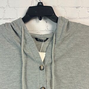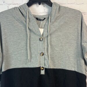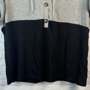 Stylish short sleeve gray and black waffle top with button details and drawstring hood. Size 2X (18/20)