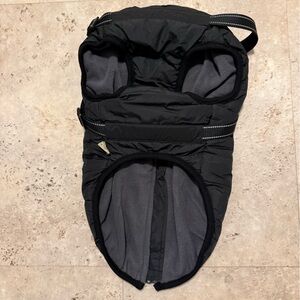 Stylish black dog jacket featuring an integrated harness. Perfect for keeping your pet warm and secure.