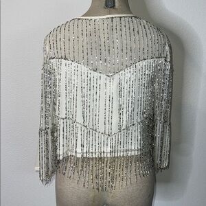 NWT size 6. Color is cream, and silver. Hook/eye closure, partially lined. Red mark on inside of collar as pictured. Approximate measurements: armpit-19”, length-17” not including fringe. J-0241