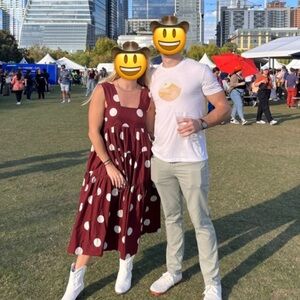 Step out in style with this fan-fave, elegant polka dot dress. Featuring a classic crimson hue with playful white polka dots, this dress is perfect for any occasion. Great for game day, pregnancy, Disney mini mouse look, day trips and date nights! Feminine, playful and classic. Enjoy a flattering fit and timeless design. Midi length dress in a babydoll silhouette with a square neckline Side slant pockets Pullover styling Lined 48"L Cotton, modal lining Size Small - fits with room to stretch to medium. Excellent pre-loved condition. Just the white polkadots seem to have turned a more pinkish hue. Fast shipping and excellent reviews. Bundle to save more. Offers welcome. Thanks for looking. 😘 Your posh ambassador.