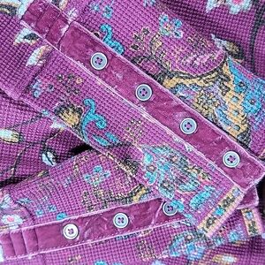 Model shot is for styling only. This shirt is new with tags and completely awesome. Ordered, but just too large for me. No flaws and has lots of stretch. Sadly Sundance is no longer in business, so their items will no longer be available from them. Excellent condition and has an extra button in case you lose one on the velvet trimmed sleeve cuff. Color is most accurate in close up with spare button.