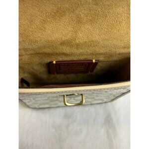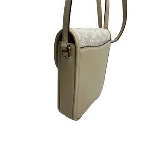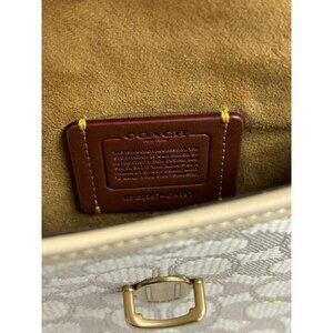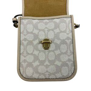 The Coach Signature Women's Style CA191 Bag in Brass/Chalk Ivory is a stylish and versatile crossbody bag perfect for various occasions such as travel, parties, or casual outings. Made with signature jacquard and glovetanned leather, this small oval-shaped bag features a quilted finish and gold hardware accents. The beige crossbody strap adds a touch of luxury to the design, while the zip and turn lock closure ensures your belongings are secure. With detachable strap and bag charm accessories, this Coach bag is a must-have for any fashion-forward woman looking for a designer touch to her outfit.