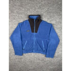 Columbia Sportswear vintage fleece jacket in youth size 18/20. Blue body with contrasting black fleece panel at the collar and upper chest. Made from 100% polyester fleece for warmth and insulation. Features a full-zip front, two zip hand pockets, elastic cuffs, and a stand collar for wind protection. Classic 90s/early 2000s Columbia styling with embroidered chest logo patch. Suitable for outdoor wear, layering, hiking, camping, or everyday cold-weather use. Shows light wear consistent with age but no stains, holes, or structural damage.