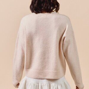 This round neck sweater features embroidered ribbon detail for a touch of elegance and charm. Perfect for adding a delicate and feminine touch to your outfit. The embroidery adds a unique and stylish element to the sweater. The round neck provides a classic silhouette suitable for various occasions. Elevate your winter wardrobe with this sophisticated and cozy embroidered sweater.