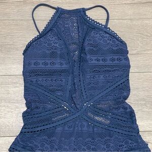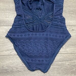 Experience the perfect blend of elegance and comfort with this BECCA one-piece swimsuit in a stunning navy color. Featuring a high neck and intricate crochet detailing, this swimsuit offers a chic and sophisticated look